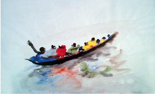 A donde va, imposible saberlo, pero la mano levantada, que podría ser pidiendo auxilio, sólo se me ocurre que pueda ser de saludo, como si el pintor ( Barceló ) estuviera viéndolos pasar, y desde la barca lo saludaran.