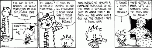 Uno de entre los grandes inventos de Calvin es el Ethicator. Este puede parecer no más que una caja de cartón boca abajo, pero en realidad dicha caja de cartón es una poderosa máquina, capaz de duplicar a una persona. Sin embargo, mediante la selección con la flecha instalada a tal efecto de la opción del Bien o del Mal, la copia se realiza utilizando únicamente lo que de bueno o de malo tenga esa persona. Calvin fue el inventor y primer usuario del Ethicator, haciendo una copia de si mismo según la versión del Bien. El resultado del proceso fue un Calvin perfectamente peinado ( Calvin se caracteriza por el pelo permanentemente rebelde ), que se levanta por las mañanas sin haber sido llamado, recoge los platos del desayuno, hace los deberes y contesta correctamente a las preguntas en clase. Asombrado por la eficacia de su invento en todo aquello que le aburre o le molesta, el Calvin real preguntará al Calvin bueno que satisfacción encuentra en comportarse de manera tan recta, a lo que este responderá, muy tieso y orgulloso, que la virtud es una recompensa en sí misma.